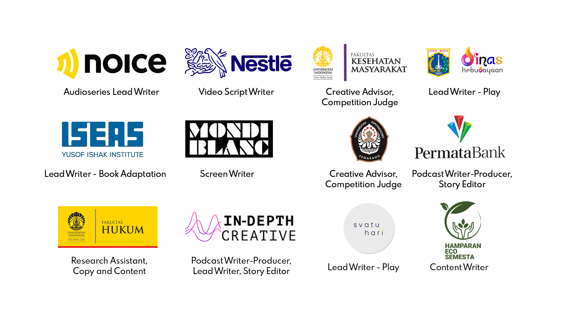 Looking to develop my skills and cement myself in the industry, I joined the podcasting company In-Depth Creative in 2022 and was also awarded a scholarship for a screenwriting course at MondiBlanc Film Workshop, Jakarta, the same year.In podcasts, I was designated lead writer for a number of significant projects that encompass original content, corporate branding, book-to-podcast adaptations, and work for podcast platforms. I have received back-to-back awards for some of my work and numerous features on platforms as a podcast writer.For films, I've done a few hobby-based movies. My first professional project is 'Eksekusi Jaminan' - a post-apocalyptic movie set in Indonesia, produced by MondiBlanc and directed by Rafael V. Marius of the Yogyakarta Institute of Arts (ISI).